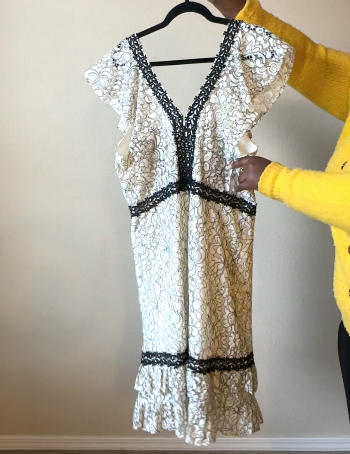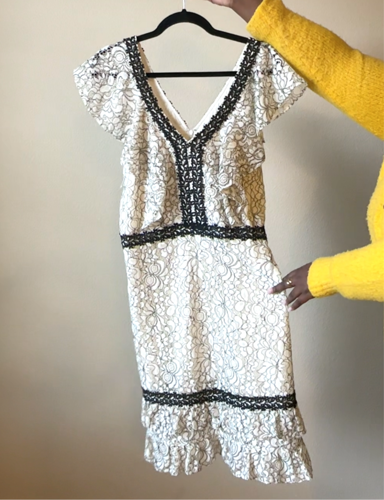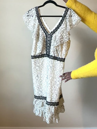 Romantic V-neck black & white lace dress with black appliqué that beautifully frames the body. This midi length dress with cover your knees with a gorgeous ruffle detail at the hem. And don’t worry it is lined.