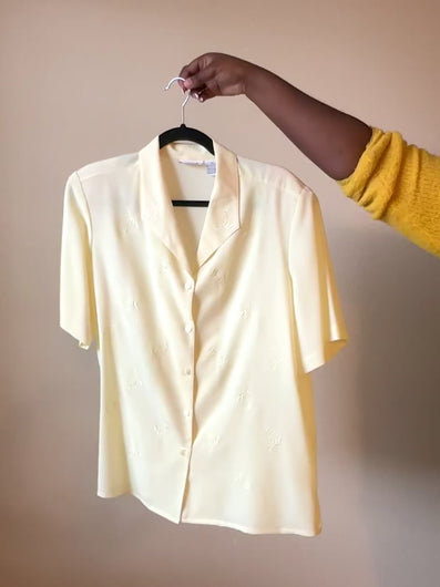 Butter yellow button down collared shirt with floral embroidery. Features a shoulder pads for a defined shoulder look, boxy silhouette, and pearlized buttons.