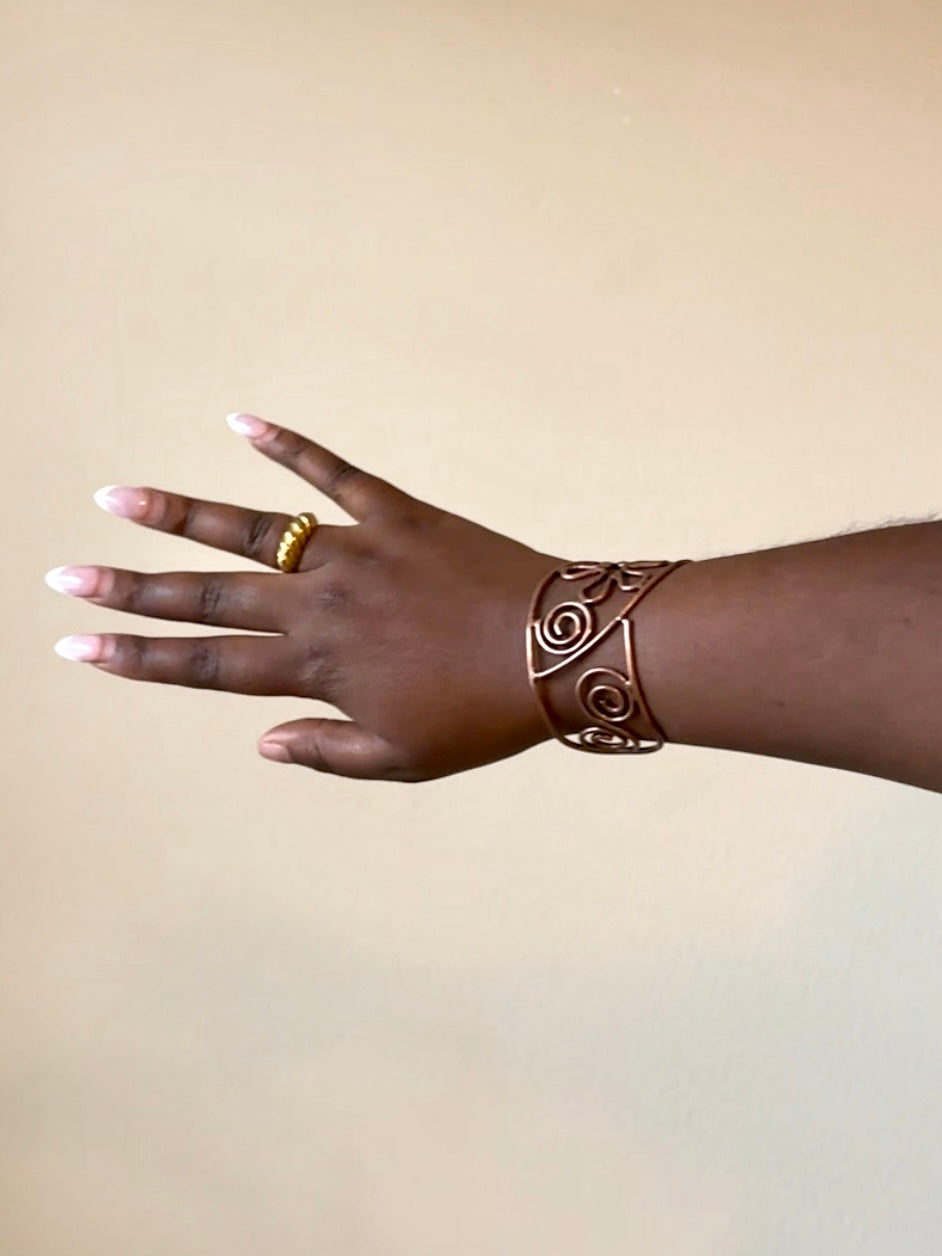 Vintage Copper wire bracelet featuring nature inspired designs. Cuff bracelet style that you can slide on and off and adjust to your wrist size.