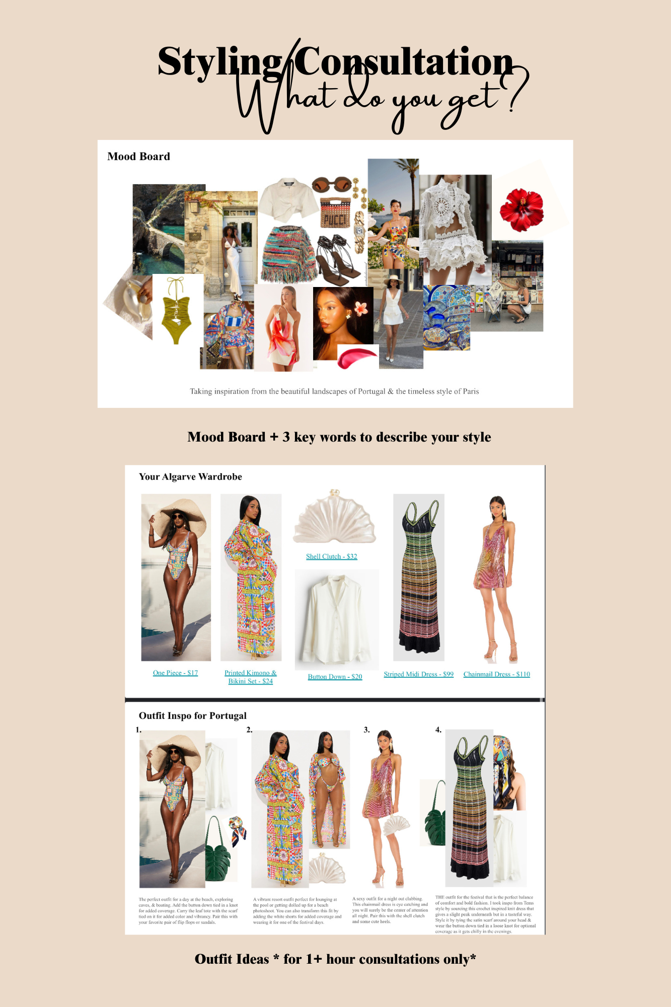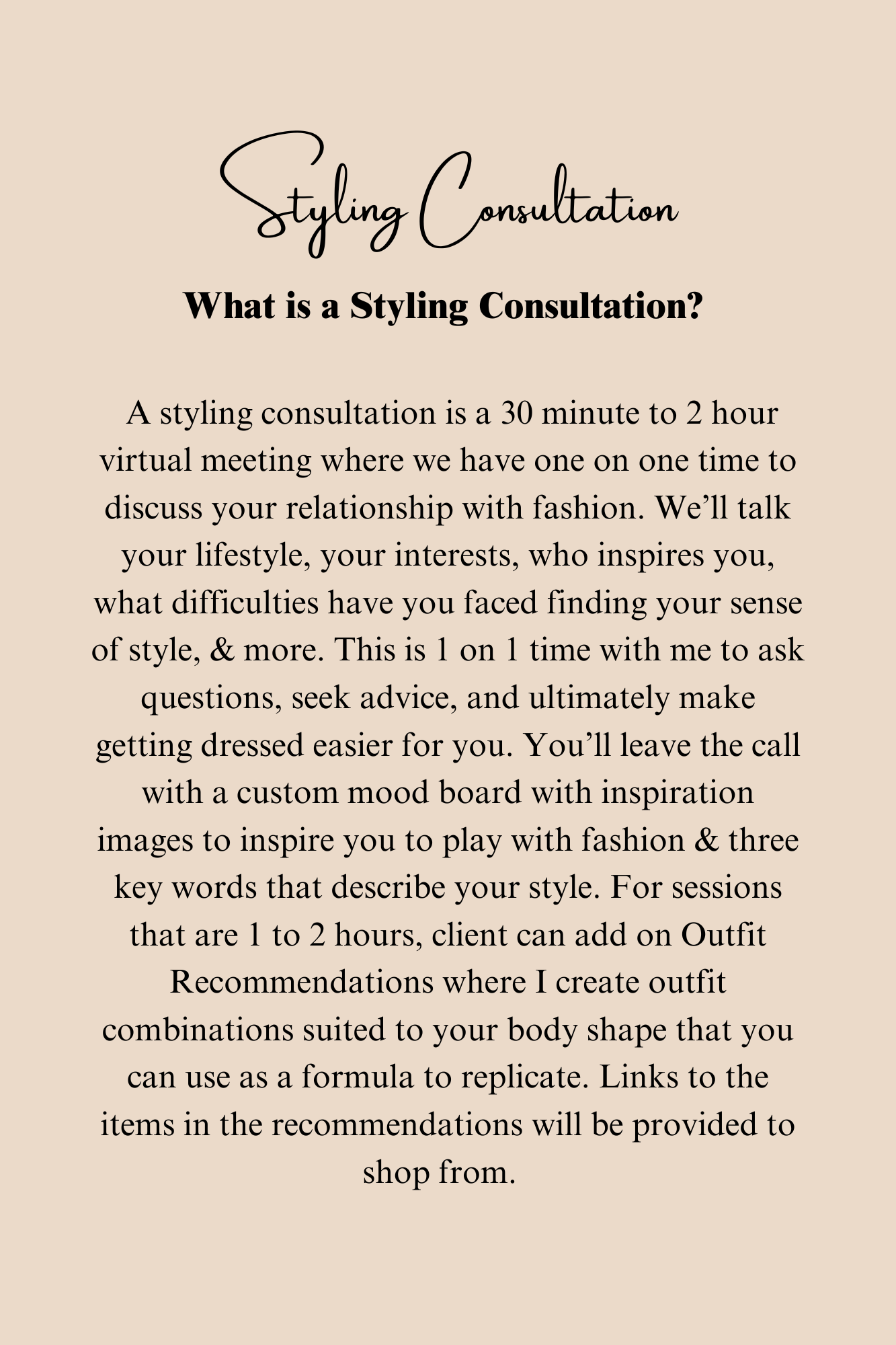 Outfit recommendations is an add-on service to a styling consultation. The time frame of the consultation will still remain the same, but you will receive a PDF of outfit formulas for your body shape with links to the items included in the outfits. The goal of this is to give you a starting point to generate outfits from.