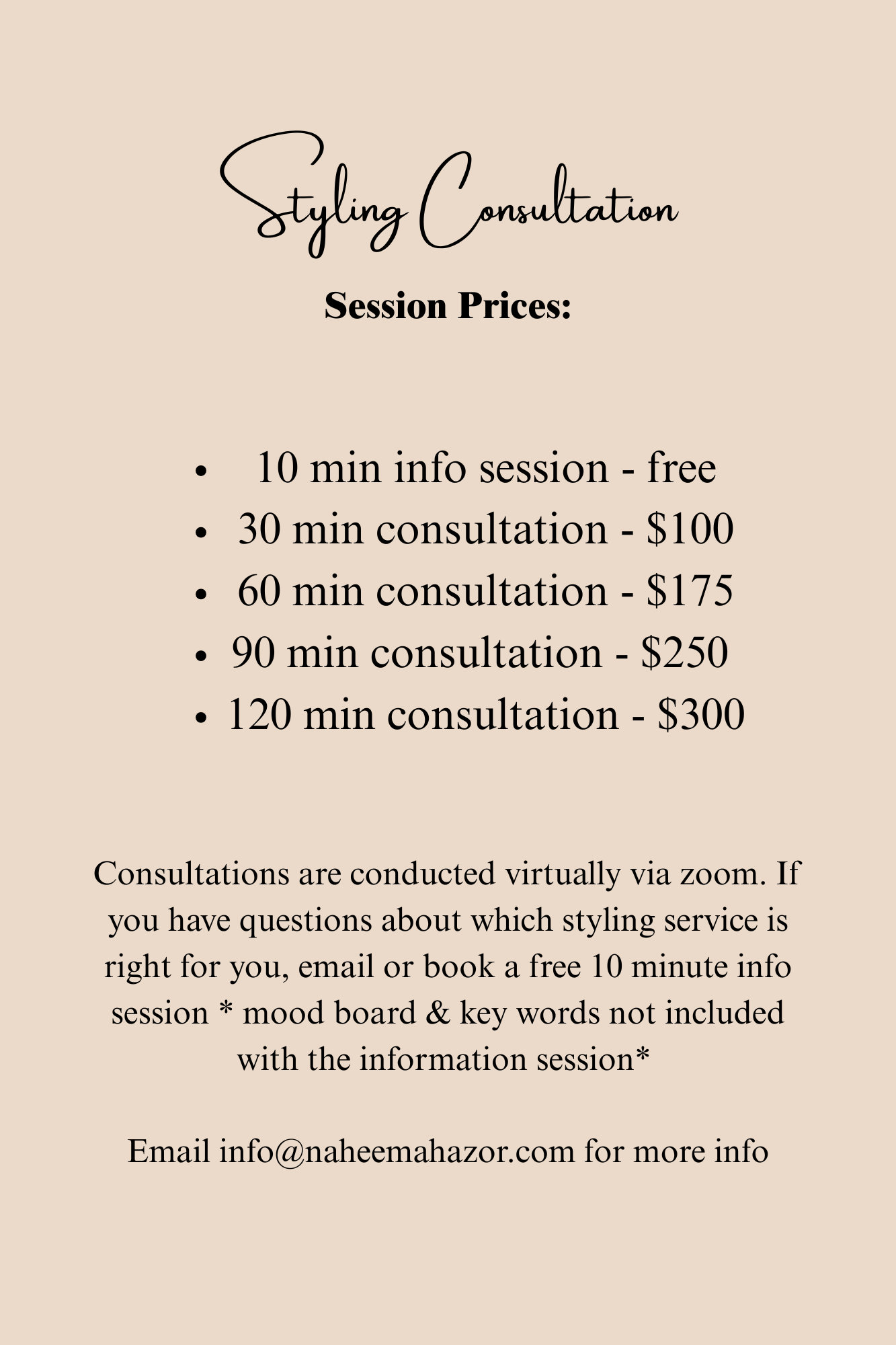 See the Styling Section for extensive details on what my styling services entail. You can book a styling consultation individually or you can add it to a closet revamp. Please note my in depth styling services like a custom style bundle, personal styling, & event styling come with a version of a styling consultation already included. If you have any questions, please email: info@naheemahazor.com